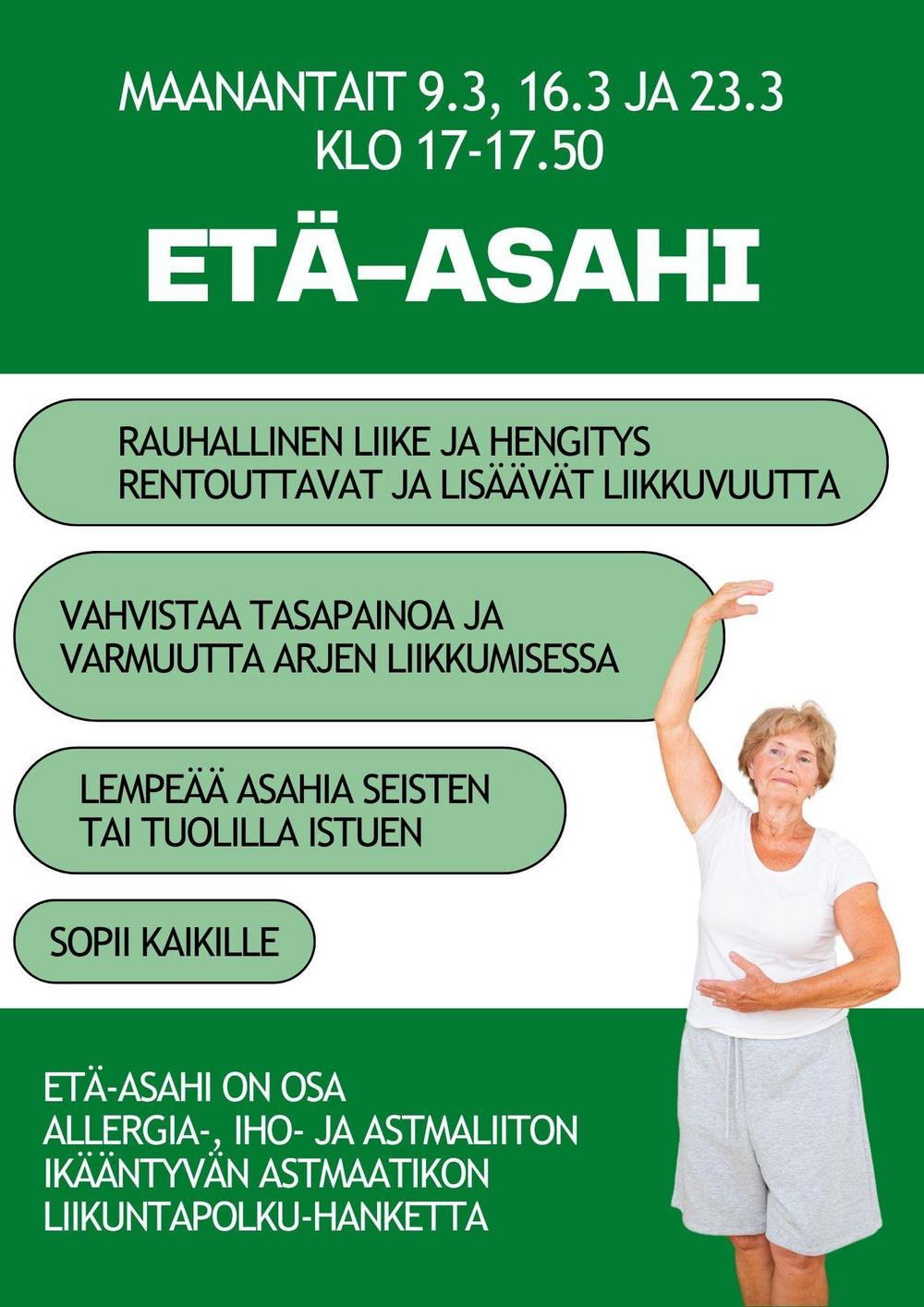 Ikääntyvän astmaatikon liikuntapolku-hanke tarjoaa kaikille maksuttoman etä-asahin kolmena maaliskuun maanantaina. Lue lisää täältä.